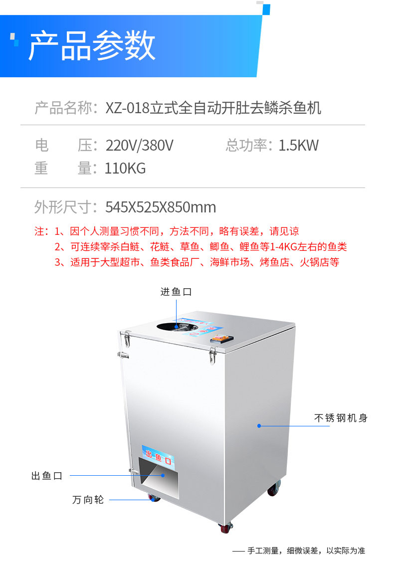 名稱開肚殺魚去鱗機 電源220/380V 功率1.5kw 產量 尺寸545×525×850mm 重量110kg 規格 其他