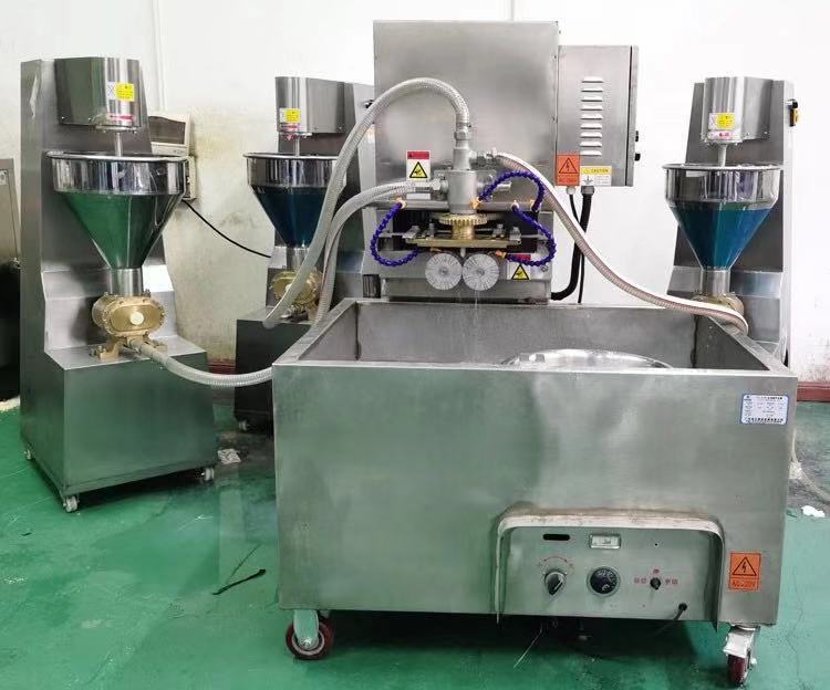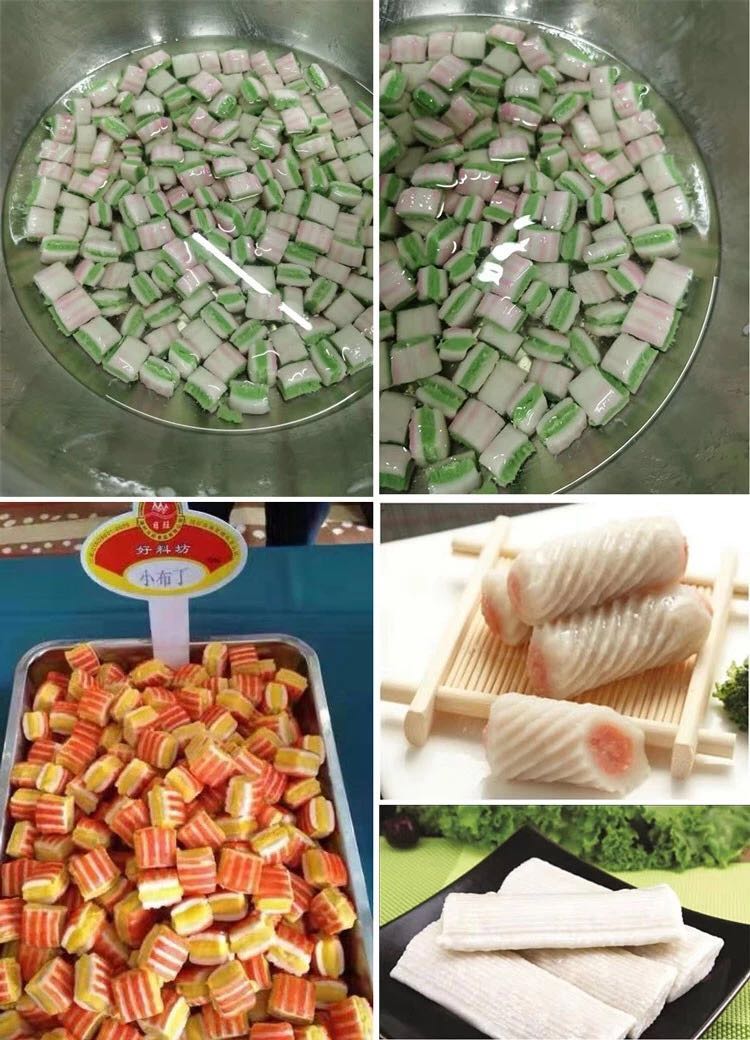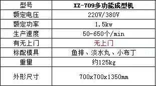 709多功能成型機新一代的多功能淡水丸機為魚肉制品成型設備,配合泵脯(供料機)使用,能生產出單色、包心及多色各種花式的品種,單色配一臺、兩種顏色配兩臺、三色配三臺。該機采用雙電機雙變頻設計,不單只是速度可調,而且產品上的條紋旋度也可調,使得做出的產品更多樣化,操作起來更方便。特別配備滾切刀,能生產出平口和圓口的淡水丸,具有一機多用的特點,可做產品:淡水丸、魚排、小布丁、鱈魚卷、蝦卷、蟹卷、烤魚棒、片片脆、鴛鴦片等火鍋料
